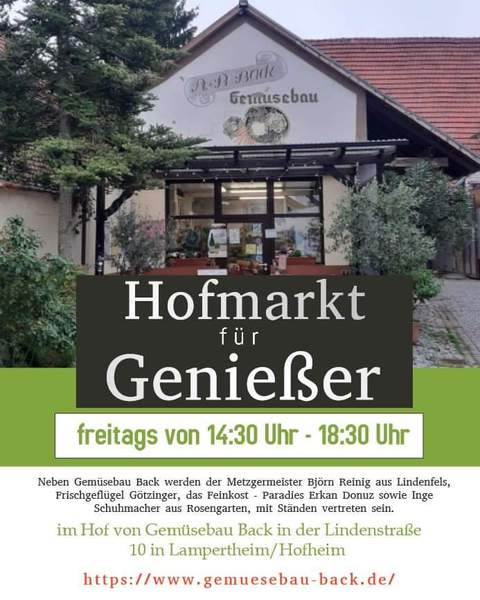Qualität von Menschen mit Herz und Verstand für Sie erzeugt - unter diesem Motto findet jeden Freitag von 14.30 bis 18.00 Uhr im Hof von Gemüsebau Back in der Lindenstraße 10 in Lampertheim/Hofheim ein "Hofmarkt für Genießer" statt.